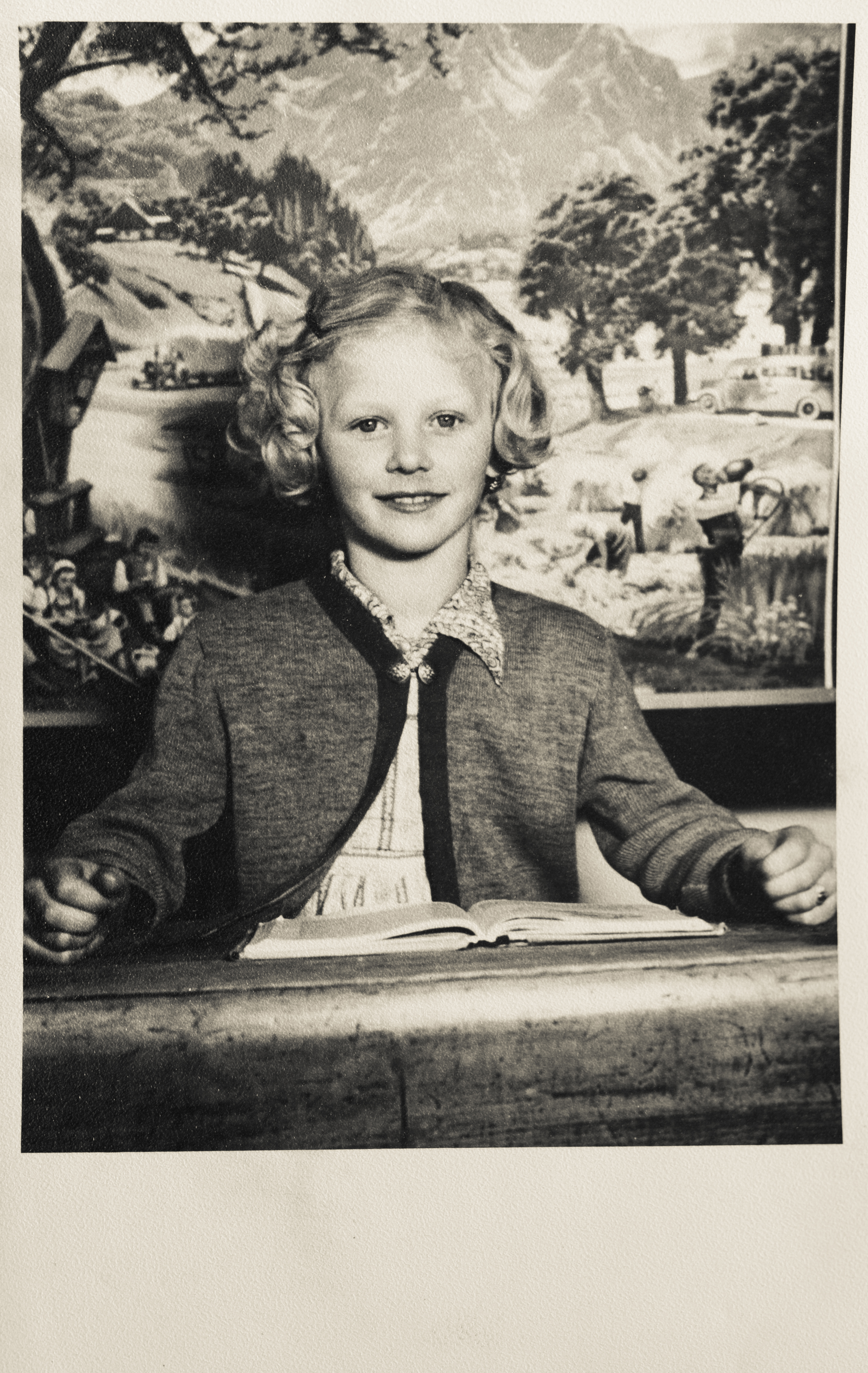 Darin steckte ein Bild, zu dem folgende Geschichte zu erzählen ist: Das Bild zeigt Maria voll Zuversicht mit prächtigen Locken in der zweiten Klasse Volksschule. Ein Jahr vorher jedoch hatte sich Maria gegen ihre Einschulung gewehrt, indem sie mit dem Bleistift ihre Kopfhaut zerkratzte, bis der Doktor entschied, der Kopf müsse geschoren werden (auf Kosten der langen, geflochtenen Zöpfe), um die eitrigen Krusten auszuheilen. Und am Foto erscheint alles prächtig nachgewachsen (allerdings nicht lange genug, um Zöpfe zu binden), insgesamt geheilt und erstarkt. In dieser Zeit entschied sich Maria dafür, selbst Lehrerin zu werden. |