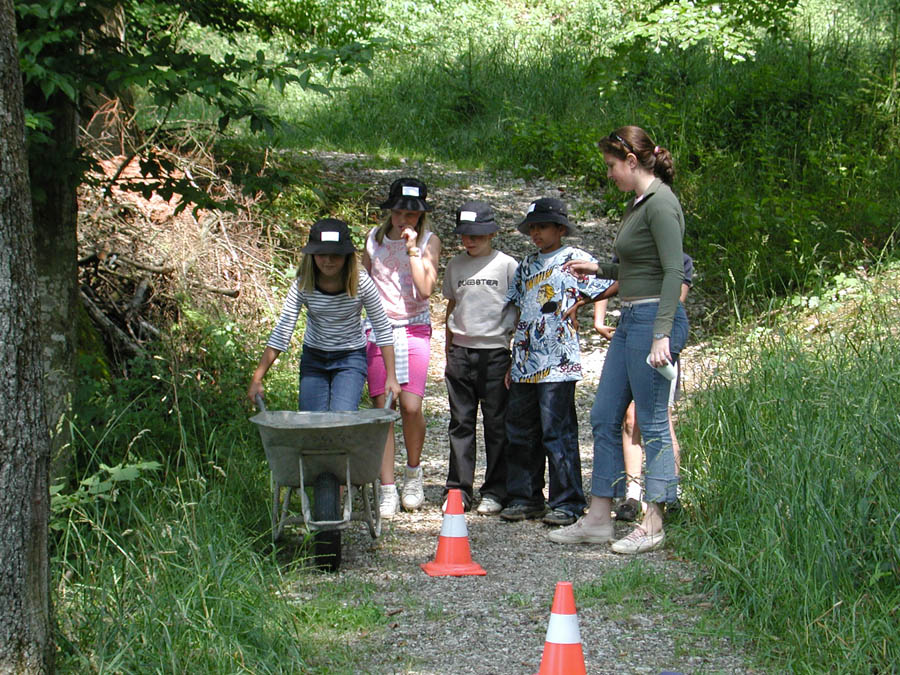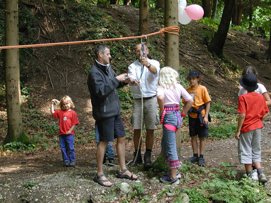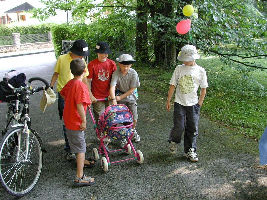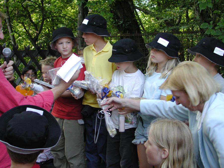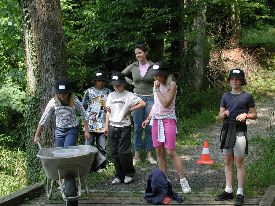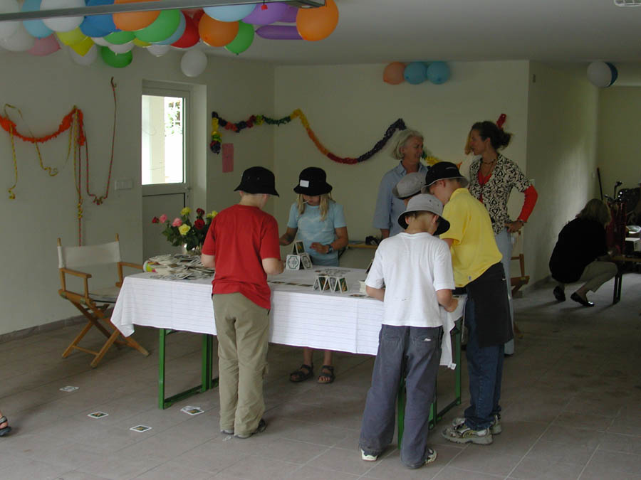 The parents prepared a series of stations in their houses, in the woods and meadows nearby. The kids passed through these stations in small groups, encountering quizzes, dexterity challenges and others; only a few of the stations are shown below.